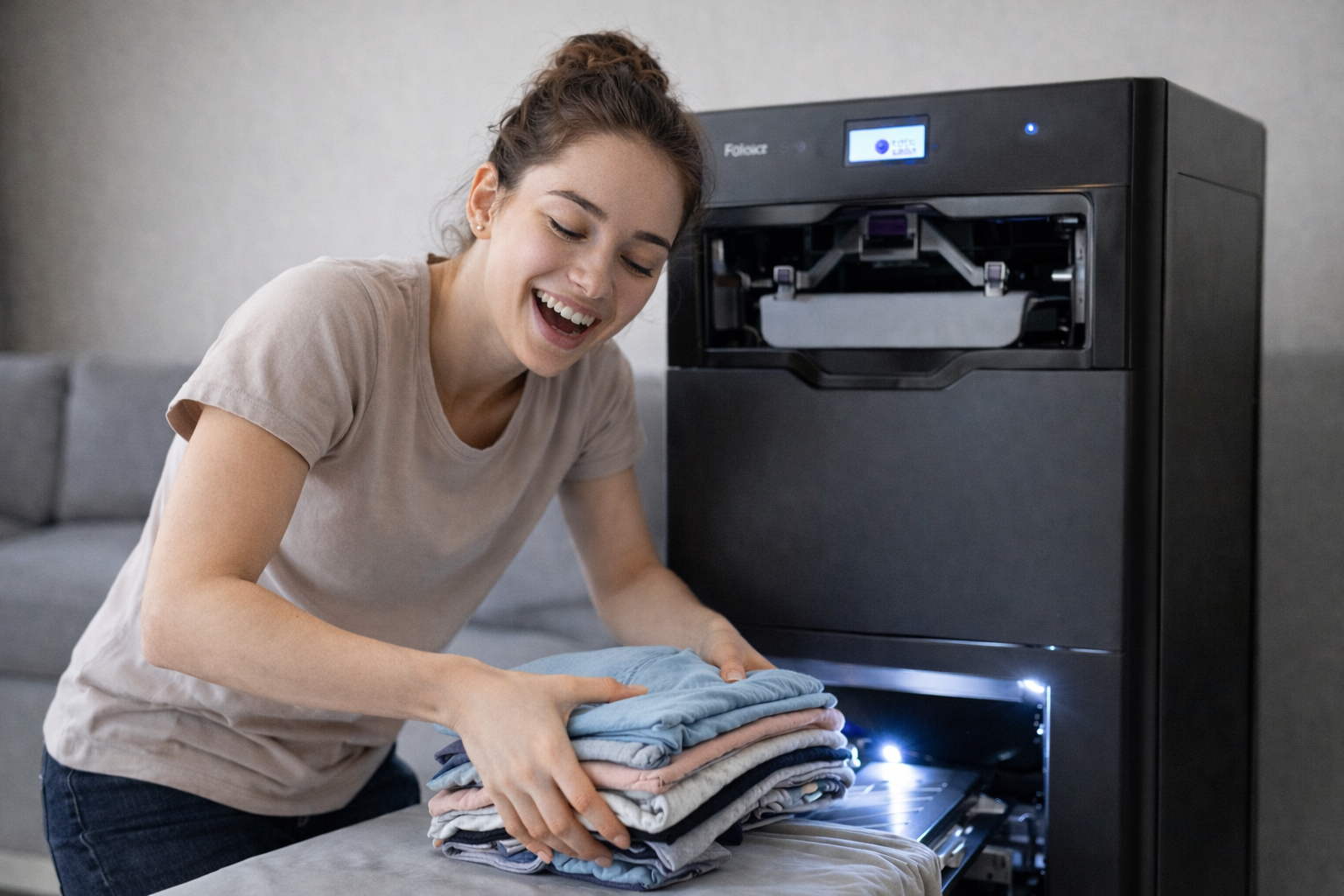 Nexoria™ kann bis zu 30 Kleidungsstücke pro Durchgang falten und glätten – ideal für Familien und Haushalte mit viel Wäsche.